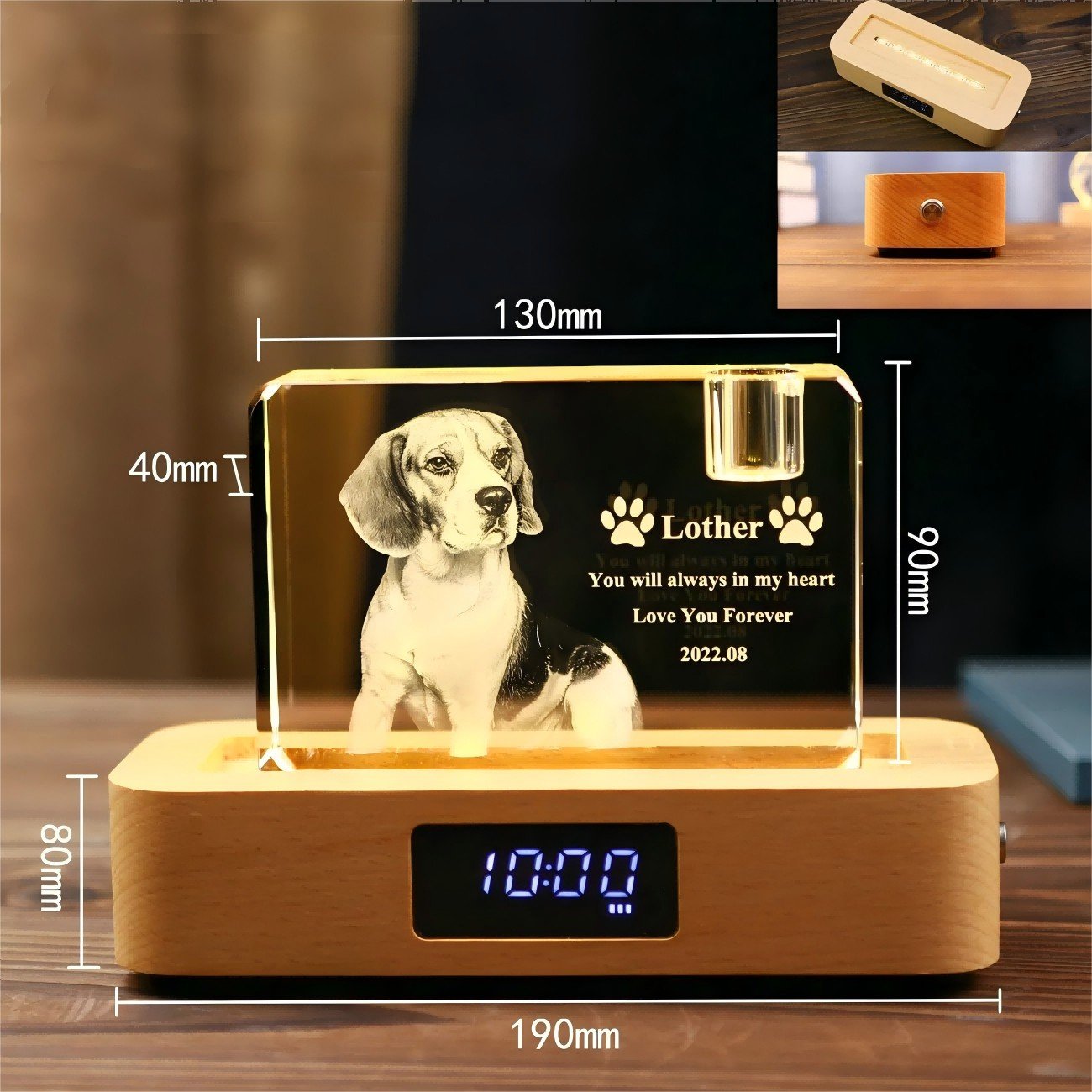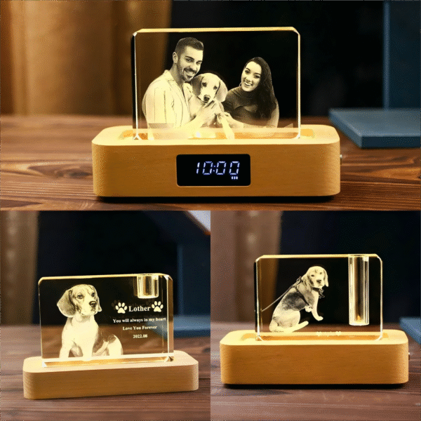 While no one can replace your pet, our Crystal Glass Block Portrait preserves their soul: crystal carves their face, a vessel holds ashes/fur, and the wooden base glows, plays your song, and counts time—turning grief into a luminous embrace of forever love.
