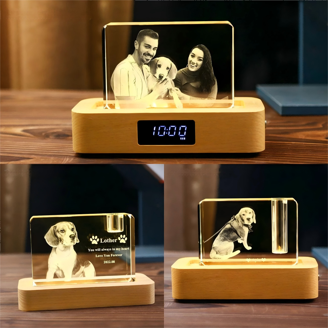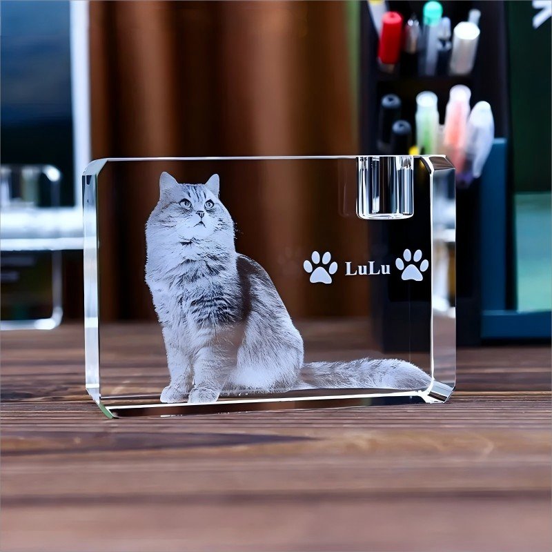 - A custom-engraved crystal panel for the pet’s portrait—crystal’s clarity preserves fine details, while its hardness ensures lasting brilliance.
