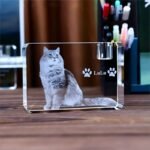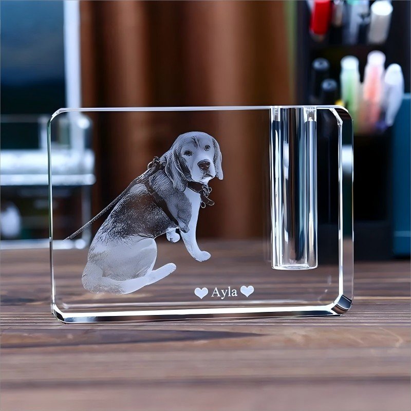 Custom-engraved crystal preserves your pet’s likeness in radiant detail; a delicate vessel beside it safeguards ashes or fur—honoring every facet of who they were.